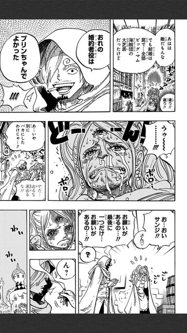 まな Twitterissa 最初から最後まで嘘偽りない言葉で本心から優しい言葉をかけ続けたサンジに対し 演技という形で自分すらも騙し続け 最後 までサンジに本心を伝えられなかったプリン 最後のお願い はそんなプリンが晒け出した唯一の本心だっただけに重みも別格