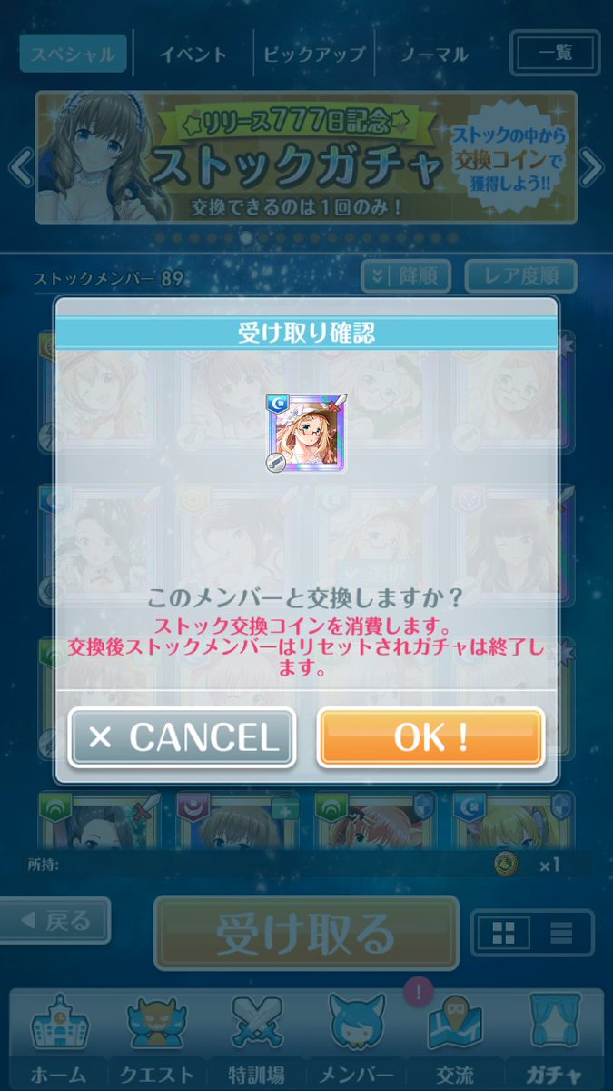 Kanyame 今回のストックガチャ 星4が8枚中 3ナタリー出たs D 今回は ワンピースのナタリーと引き換え 最近のgodガチャ 777ガチャ お揃いガチャ と 最近爆死が続いてるので クォーツはなくなったけど ストックガチャとか 結構開催してくれる