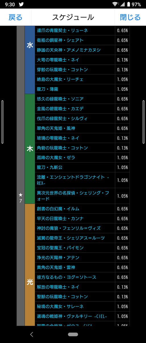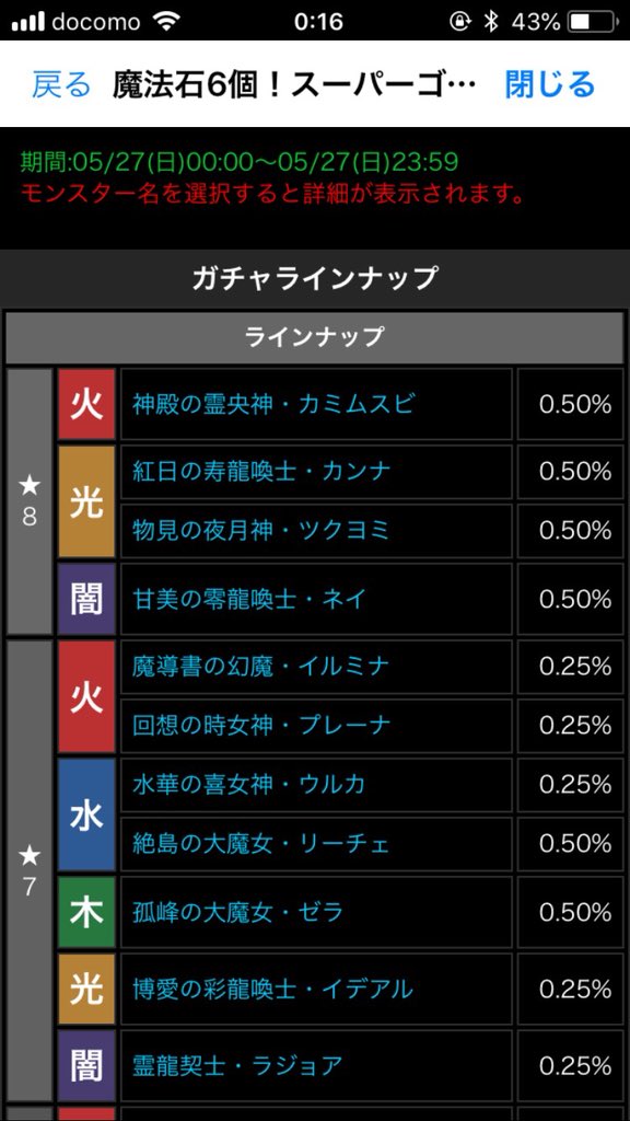 ら みっ ヮ し あ 星七を今まで通りそれぞれ2 5 とすると 星七が15体で各2 5 全体37 5 星六は8体で各約7 8 全体62 5 確率予想はこんな感じ カナー いつものスーパーゴッドフェスのフェス限の確率よりも心做しか上の確率で星七が来ますね
