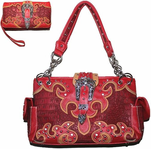 Amazon ラインストーンメタルバックルカウガールクロコダイル革の女性のハンドバッグ Matching財布赤で Texas Western Online ショルダーバッグ