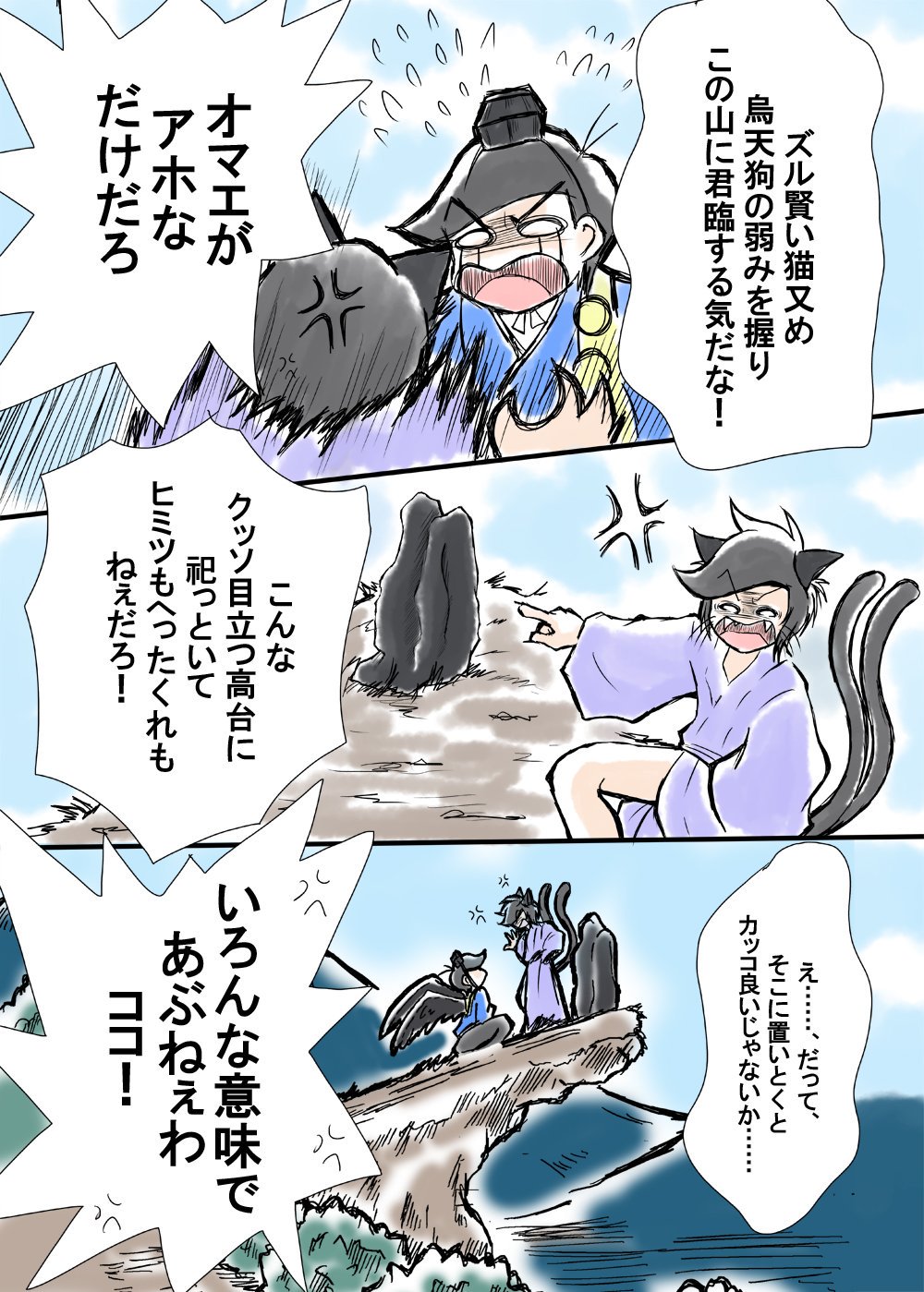 こやぎ 妖怪松その 烏天狗 猫又 先代の神通力が込められた大事な大事な石碑を カッコイイ の一点だけで危険に晒すアホな烏天狗 もう完全にツッコミ役になっちゃった猫又 妖怪としての階級は烏天狗のほうが上なのに おツムは猫又のほうがキレる