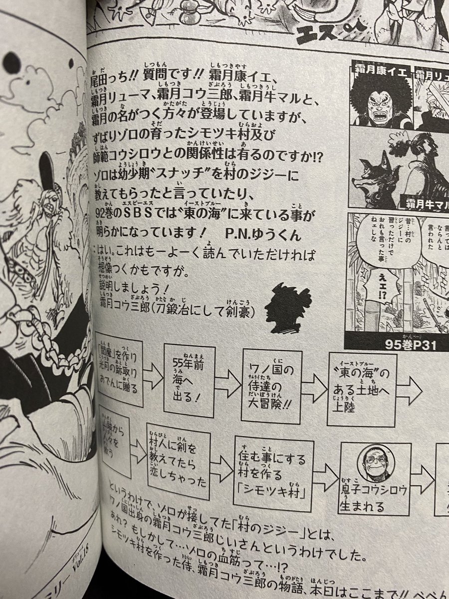 ドリュッケン One Pieceはsbsも濃密で良い というかサラッとコウシロウとくいなの2人がワノ国の血筋って分かってビビった この書き方だとゾロも霜月一族の血筋なんだろうなぁ 凄い 語彙無