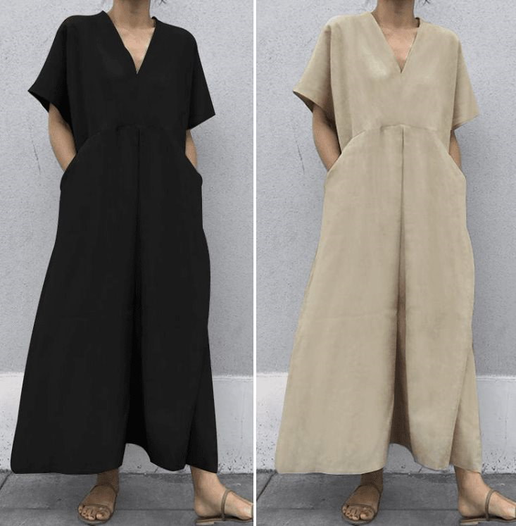 Qoo10 2色4サイズ夏新入荷韓国ファッション 中長丈リネン ゆったり Vネック 短袖 ワンピース カジュアルワンピ ポケット
