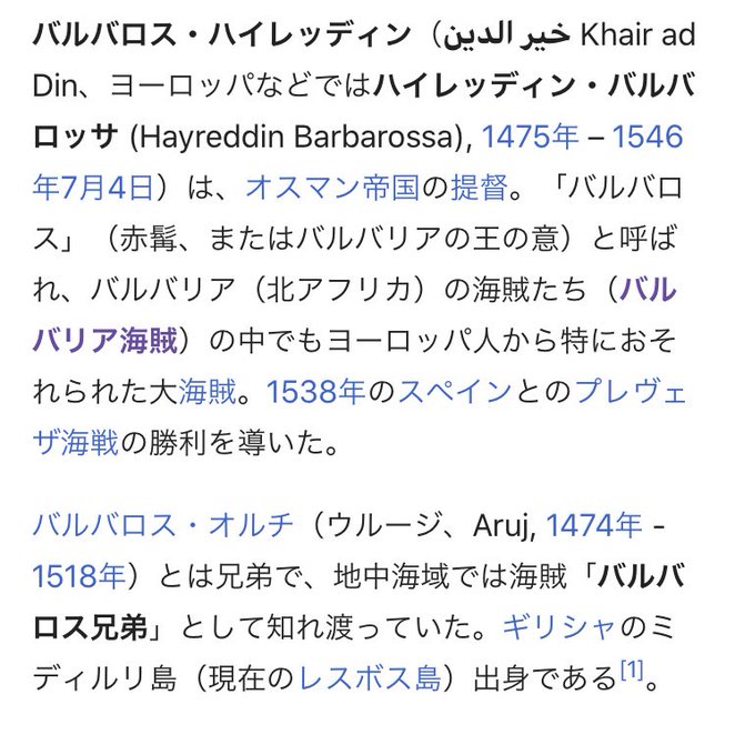 動画ID sm 動画タイトル あきゅうと雑談 第52話 「赤髭の海賊王」 投稿日時 17年12月31日 7時34分29秒 長さ. 海賊というのは不思議な存在だ。 「賊」なのだから悪なのだけれど、必ずしもそうとは言えないところがあって、大人気漫画ワンピースのモチーフにもなっているのだけれど、海賊について考える時「正義」とは何かという点について深く考えさせられることになる。 世界史において、海賊で. バルバロス・ハイレディン バルバロス・オルチ (ウルージ、Aruj, 1474年 - 1518年 )とは兄弟で、地中海域では海賊「 バルバロス兄弟 」として知れ渡っていた。 ギリシャ のミディルリ島(現在の レスボス島 )出身である 。.