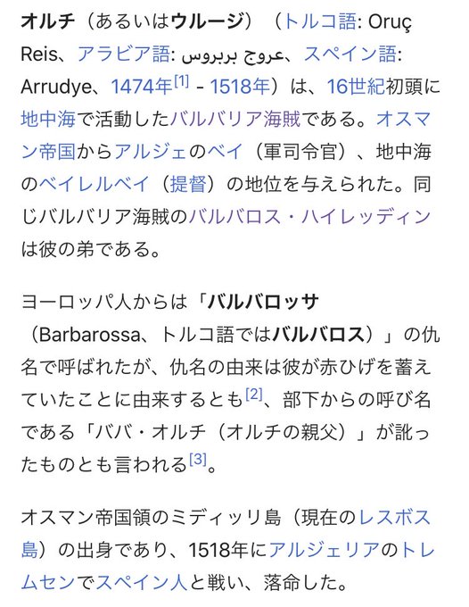 バルバロス・オルチ(ウルージ、Aruj, 1474年 - 1518年)とは兄弟で、地中海域では海賊「バルバロス兄弟」として知れ渡っていた。ギリシャのミディルリ島(現在のレスボス島)出身である。. Arrudye 、1474年 - 1518年)は、16世紀初頭に地中海で活動したバルバリア海賊である。 オスマン帝国からアルジェのベイ(軍司令官)、地中海のベイレルベイ(提督)の地位を与えられた。. バルバロス・オルチ (ウルージ、Aruj, 1474年 - 1518年 )とは兄弟で、地中海域では海賊「 バルバロス兄弟 」として知れ渡っていた。 ギリシャ のミディルリ島(現在の レスボス島 )出身である 。.
